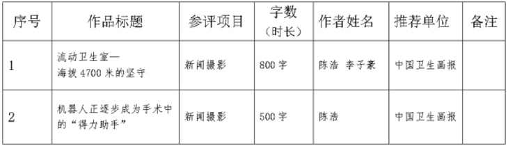 按照中国期刊协会《关于开展第35届中国新闻奖新闻期刊作品初评工作的通知》要求,中国卫生画报拟推荐2件作品参加第35届中国新闻奖新闻摄影作品的评选,现予以公示。