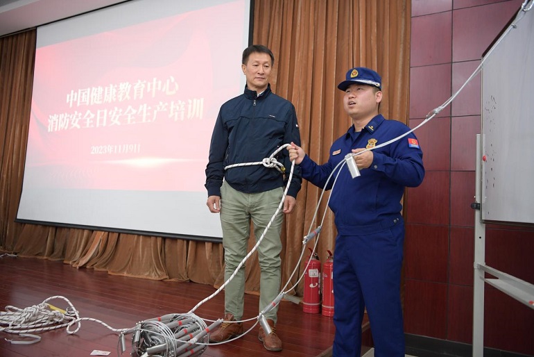 张彦龙同志是北京市东城区安定门外消防救援站副站长,有多年的消防救援经验,带队圆满完成近年多项重大活动的消防安保任务。张彦龙同志对中心消防应急疏散演练和灭火器实操进行了点评,充分肯定的同时也进一步强调了防止踩踏和灭火器使用的注意事项。在授课培训环节,张彦龙同志结合中心实际就消防法律法规、消防基本常识、消防设施器材标志及使用方法、发生火灾时的处理方法及如何自救逃生等方面,通过大量案例与干部职工进行了互动交流。同时,还向中心职工演示了消防逃生绳、逃生软梯的使用方法,教会中心职工在发生火灾后,如何正确判断、紧急处置,在最短时间内扑灭火灾和自救逃生,减少火灾带来的损失。